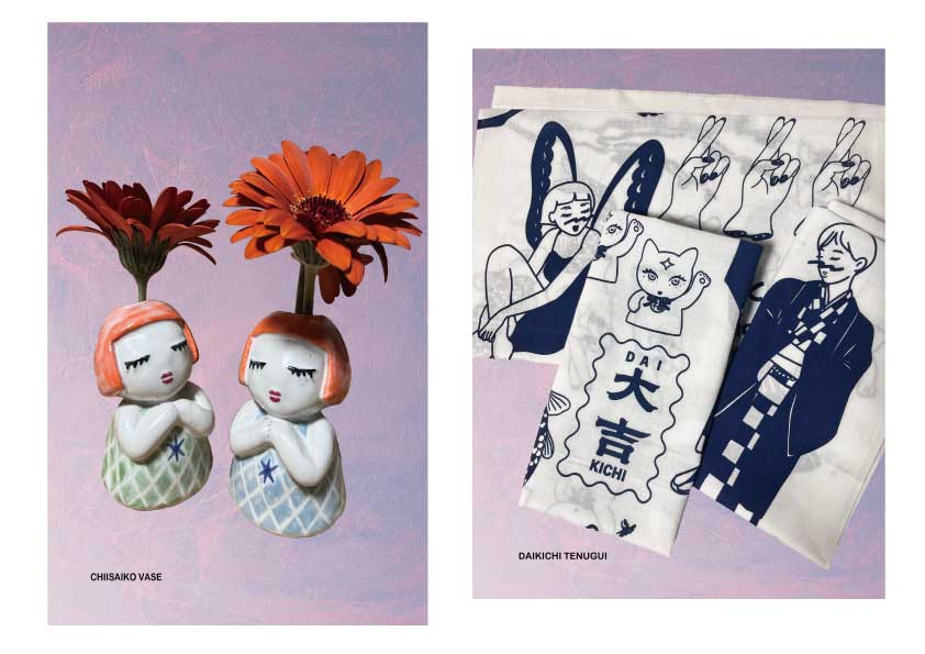 (写真左から)《小さい子VASE》陶、釉薬 /《大吉手ぬぐい》