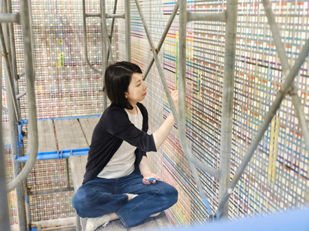 川人綾グリッド状の絵画のなかに「制御とズレ」を表現するアーティストです。京都での学生時代に日本の伝統的な染織を学んだことから、緻密な手作業の過程で否応なく生じる「歪み」に着目し、そこから生まれる人間の制御を超えた美しさを絵画上で表現しています。また、神経科学者である父の影響もあり、錯視効果がもたらず「ズレ」に注目した格子状に鮮やかなグラデーションが広がる作品は、視点によって多様な表情を見せます。
