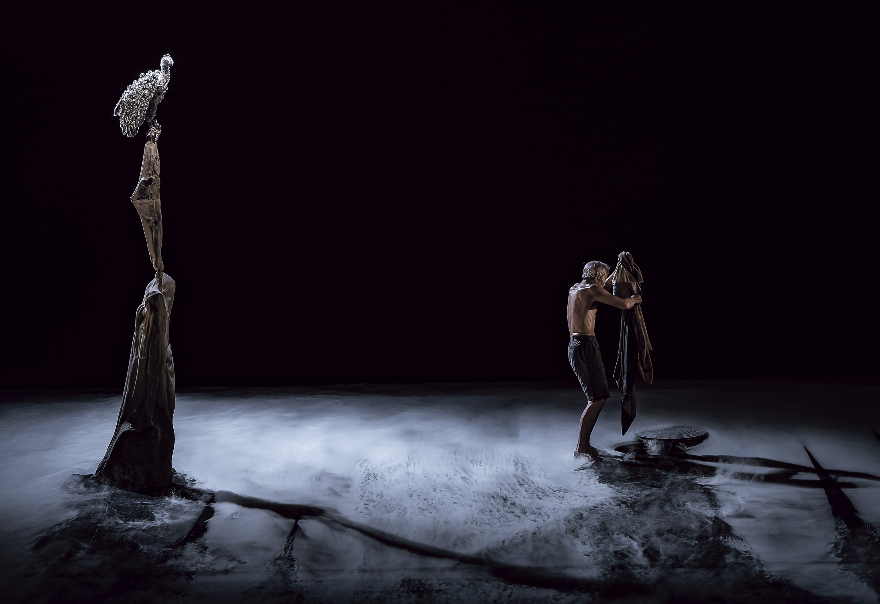 かつて田中泯が主宰した「アートキャンプ白州」で出会った2人は継続的にその親交を深め、2024年1月、初のコラボレーションとなる同作が山梨・甲府にて公演されました。同作では一羽のハゲタカとうつろう霧、赤い泥による舞台美術を通じて、田中泯が問い続けてきた身体と気象、都市の外部といったものたちを接続し、まるで一つの“現象”のような舞台がつくり上げられました。