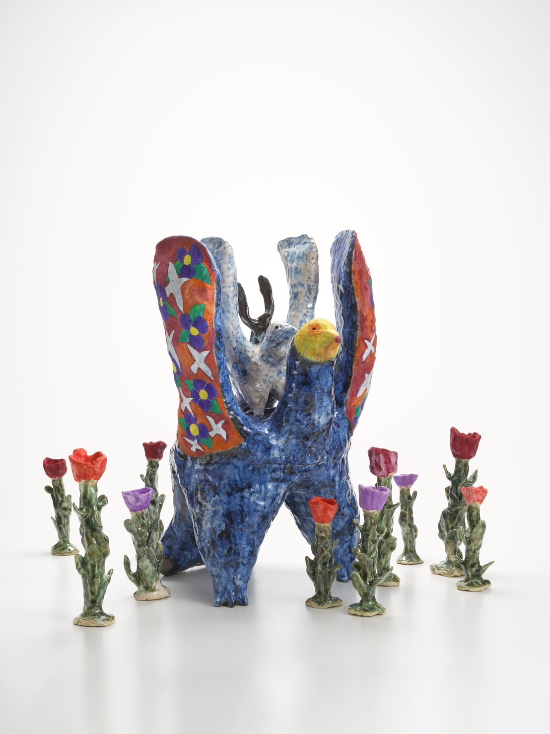 リュ・ジェユンは韓国出身、2021年に京都市立芸術大学院美術研究科修士課程陶磁器専攻を修了し、以降京都とソウルを拠点に活動を続ける作家です。さまざまな出会いや経験を通じて変わる自身の考えやアイデンティティを、陶芸をベースにユニークな質感と色味、それに合わせた油絵具や金など多様な材料を組み合わせて「自画像」を制作しています。新作のモチーフとして登場するカモメには、内陸のローマに生息するカモメたちは海を見たことがないという事実に着目し、故郷を離れ異邦人として生きる自身の姿を重ねています。