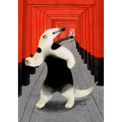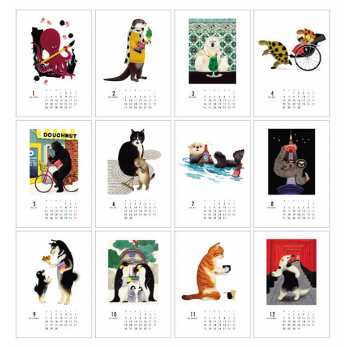擬人化された動物が本を読んでいる様子が愛らしく、海外からの旅行者にも選ばれています。「動物の形、骨格、毛並み、すべてが美しい。それらを見ているとシンプルに生命を感じる」と語る小林の新たなシリーズをこのたび本展で初公開します。「Stroll around Kyoto」では、京都を散歩しながら名所や銘菓を楽しんでいる動物たちの様子を生き生きと描いています。京都らしい店やモチーフは、京都 蔦屋書店のスタッフが推薦した場所や食べ物を参考に制作され、今回小林が取り組んだZINEの中でスケッチやMAPとなり紹介されています。12種類の作品は、すべて原画とジークレープリントにて販売、年の瀬に合わせてカレンダーもご用意しました。