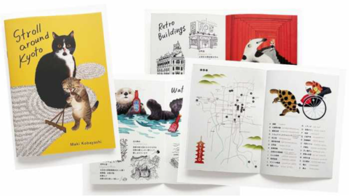 12種類の作品をメインに、京都 蔦屋書店スタッフのおすすめスポット、食べ物などを小林マキがスケッチ風の絵で紹介しています。各スタッフのおすすめスポットは動物アイコンの形で地図上に紹介されています。
