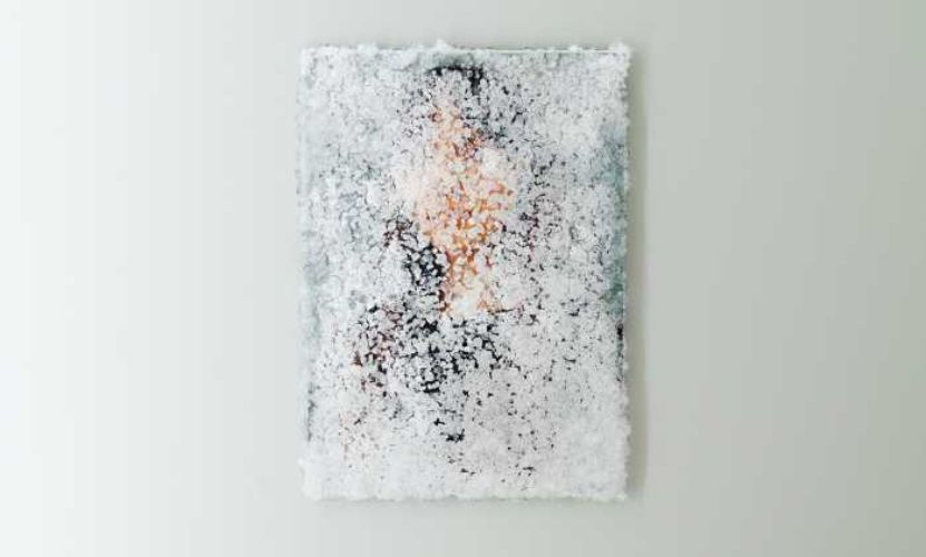 田中嵐は、2000年福岡出身のアーティスト。鉱物を主成分とした結晶液に、自身が撮影した風景や人物の写真を浸し、表面を結晶化させた作品を手掛けています。結晶化の工程では、雨の音や被写体の心音などといった写真と関連する音をスピーカーから流し、音の振動によってあえて不均等な結晶を生み出します。