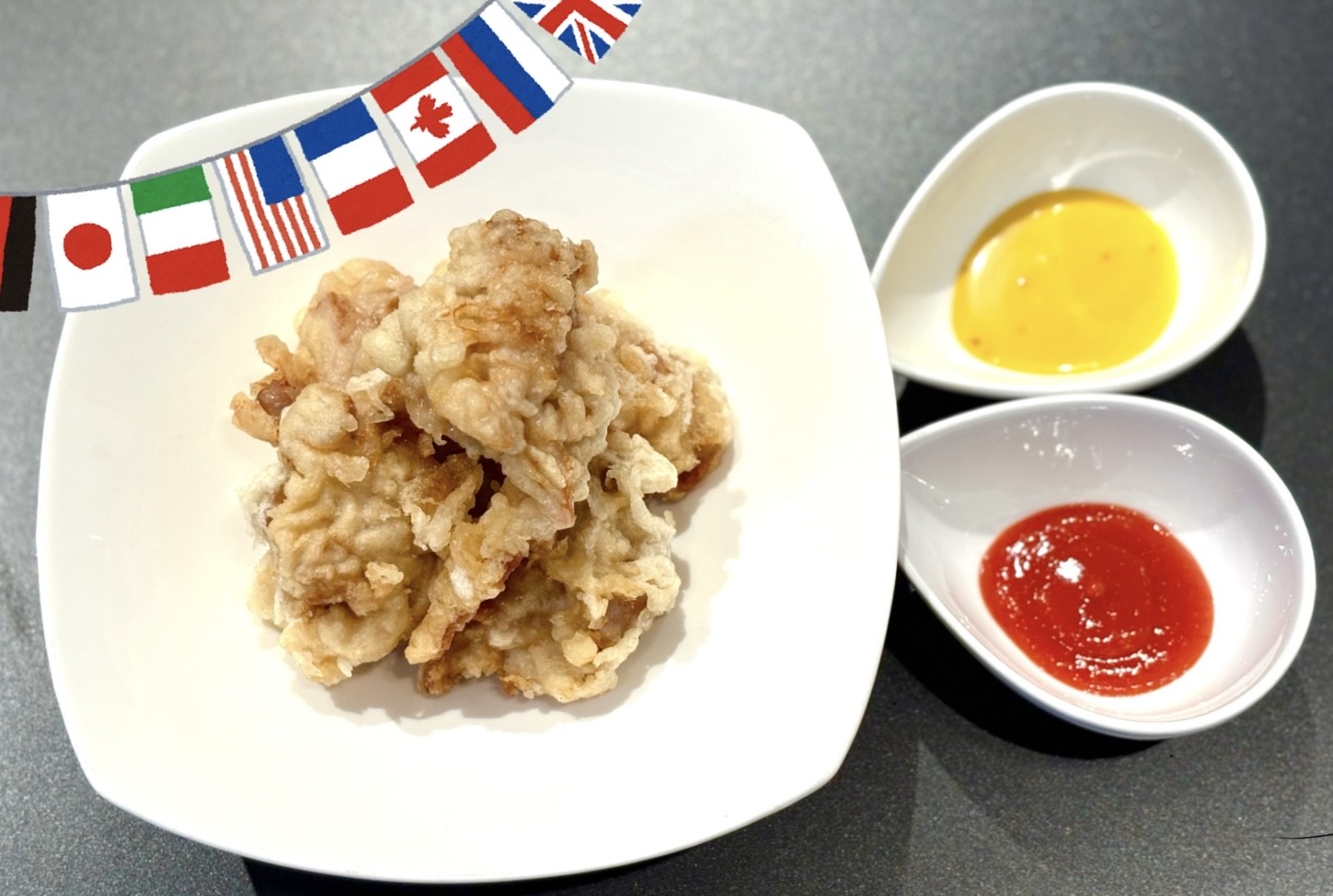 ろっぽんぽんのWinter Market企画は『ろっぽんぽんのからあげを世界のソースで楽しもう!』ろっぽんぽんの名物、ジューシーからあげを限定ソースで食べてみよう!ハニーマスタードが勝つか?シラチャーソースか!?はたまた別の国か⁈お客様の一番を確かめにいらしてください!