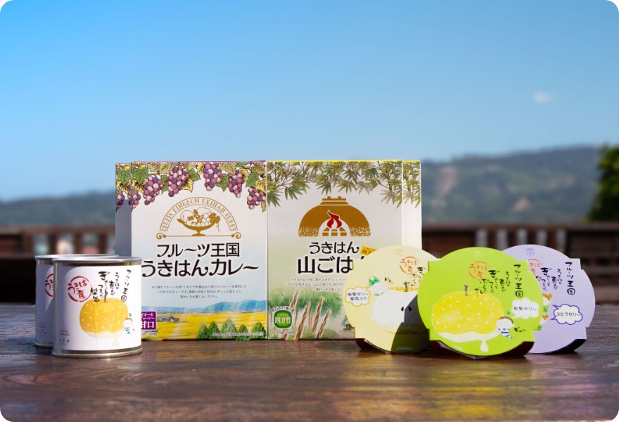 富有柿(冷蔵柿)、キウイ、梨などの新鮮なフルーツ、道の駅オリジナル加工品(うきはんカレー、四方竹の炊き込みご飯、柿まんじゅうなど)