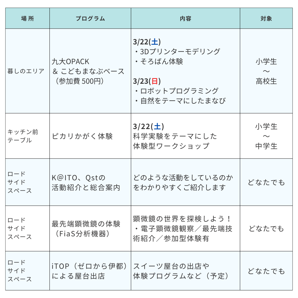 九州大学 伊都キャンパスの近隣に位置する「いとLab+」を中心として、地域社会とアカデミアによる「共創の場」を創出・発展させることを目指し、様々な主体が参画する「K@ITO(カイト)」によるサイエンスマルシェを九大伊都蔦屋書店で開催します。