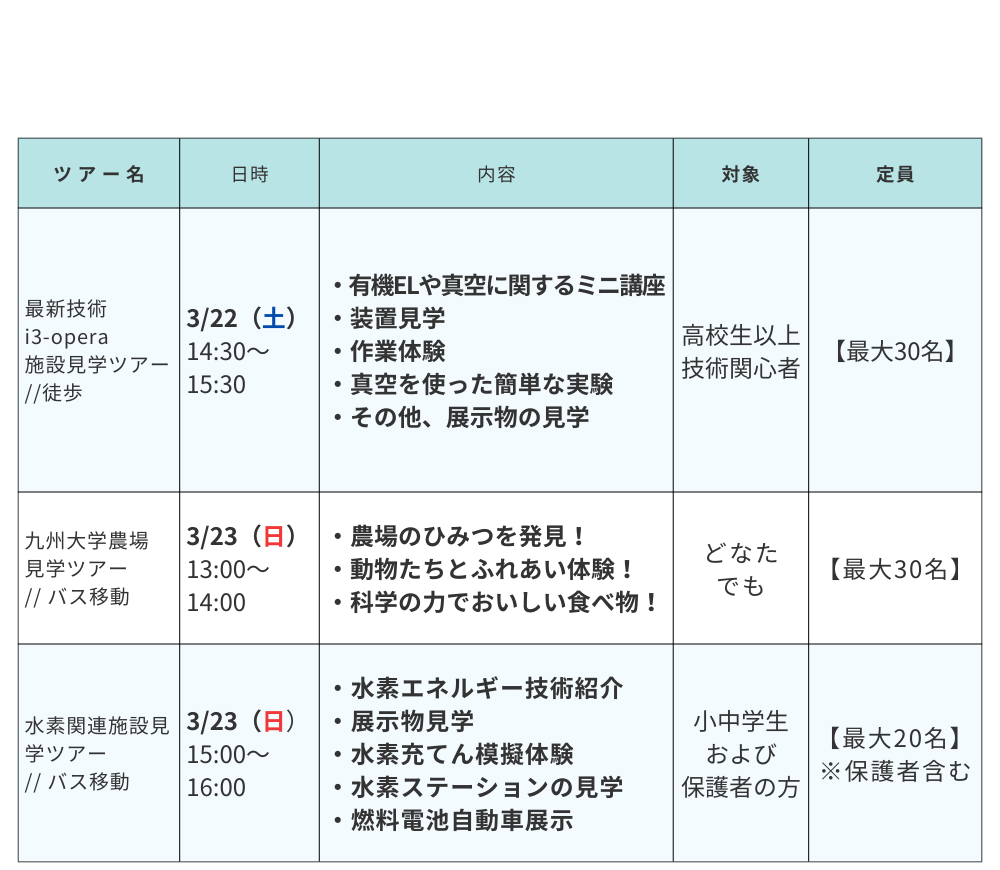 九州⼤学は、⽇本で最初にできた⽔素ステーション(実証⽤)や、⽔素エネルギーを⾏っている研究施設も複数あり、伊都キャンパス全体で脱炭素社会の実現に向けた研究を⾏っています。最近よく⽿にするようになった「⽔素エネルギー」への理解を深め、私たちの⽇常⽣活への関りを楽しく知ることができる体験型⾒学会を開催します。