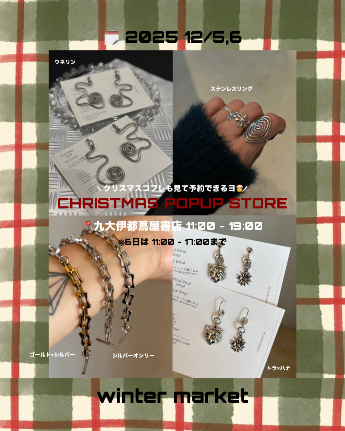 イベント期間限定、クリスマスラッピングをご用意。¦モードチックで癖になるアクセサリー¦程よく溶け込む一癖デザインが、目に留まるイムルの非日常的な形や世界観をお楽しみください。クリスマスコフレを実際に見て、予約や購入ができます。※ 2日目は17:00までです。