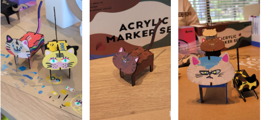 あらかじめ猫の形にカットされた木製の板(出来上がりサイズ約7cm)に、アクリルマーカーを使って自由に絵付けをしていただきます。講師がレクチャーしますので、絵に自信がない方でも安心してご参加いただけます。様々なデザイン見本やインスピレーションを用意しておりますが、ご自身の愛猫をモデルにしたり、自由な発想で個性的な板猫を制作することも大歓迎です。