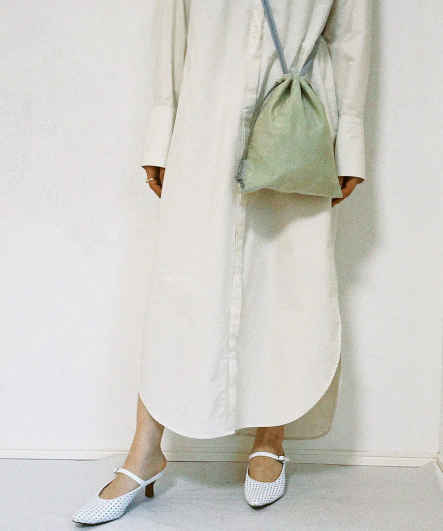 生地はデザイナーが市場で探して見つけた、こだわりのもの。本体とショルダーストラップもそれぞれ違う生地を使用しました。触り心地や、生地の表面感にもこだわった巾着バッグ。サイドについているブランドネームもポイント。