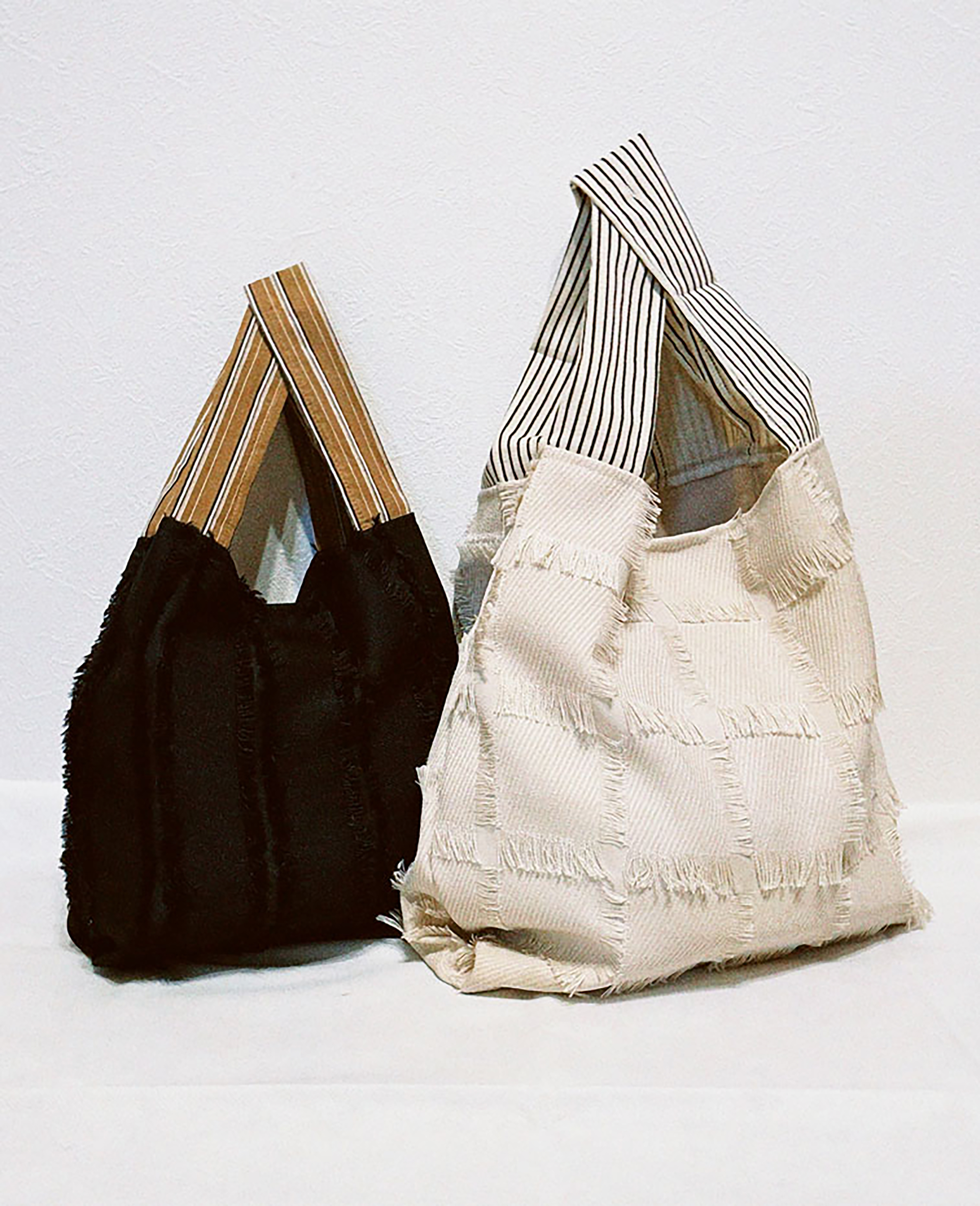 生地はデザイナーが市場で探して見つけた、こだわりのもの。本体と持ち手もそれぞれ違う生地を使用しました。触り心地や、生地の表面感にもこだわったトートバッグ。