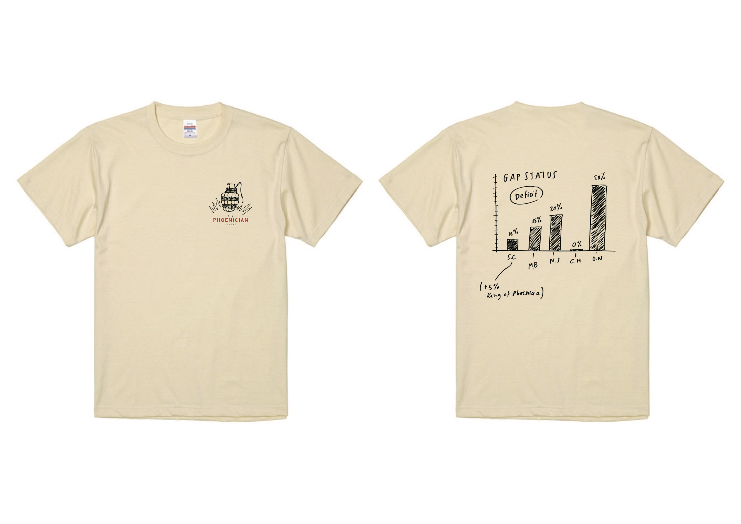 Tシャツの前面、胸元には、ザ・ザ・コルダが出資者たちに手土産として渡す手榴弾のイラストが配置されています。
