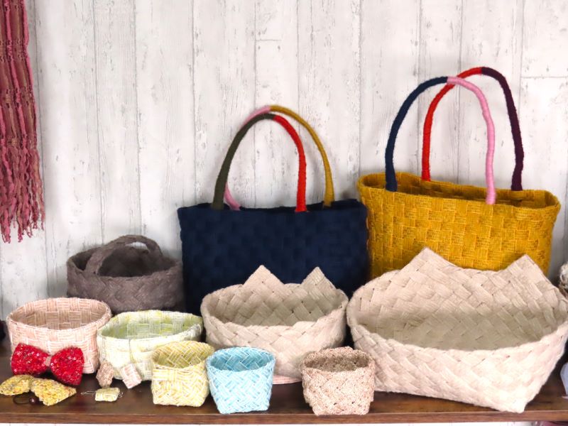 モロッコかご編みを使い、Tシャツヤーンや月桃、レモングラス、い草を素材に色んな糸でかごを作り布やレース、リボンを組み合わせ、生活の中で眺めて、香って、楽しんで貰えたらとバックや雑貨に仕立てています。
