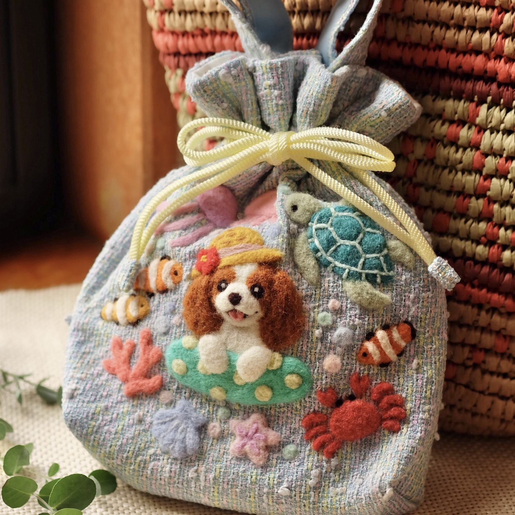 お好きな犬種のわんことマリンモチーフを羊毛アップリケして持ち手付きのきんちゃくミニバッグに仕上げます。