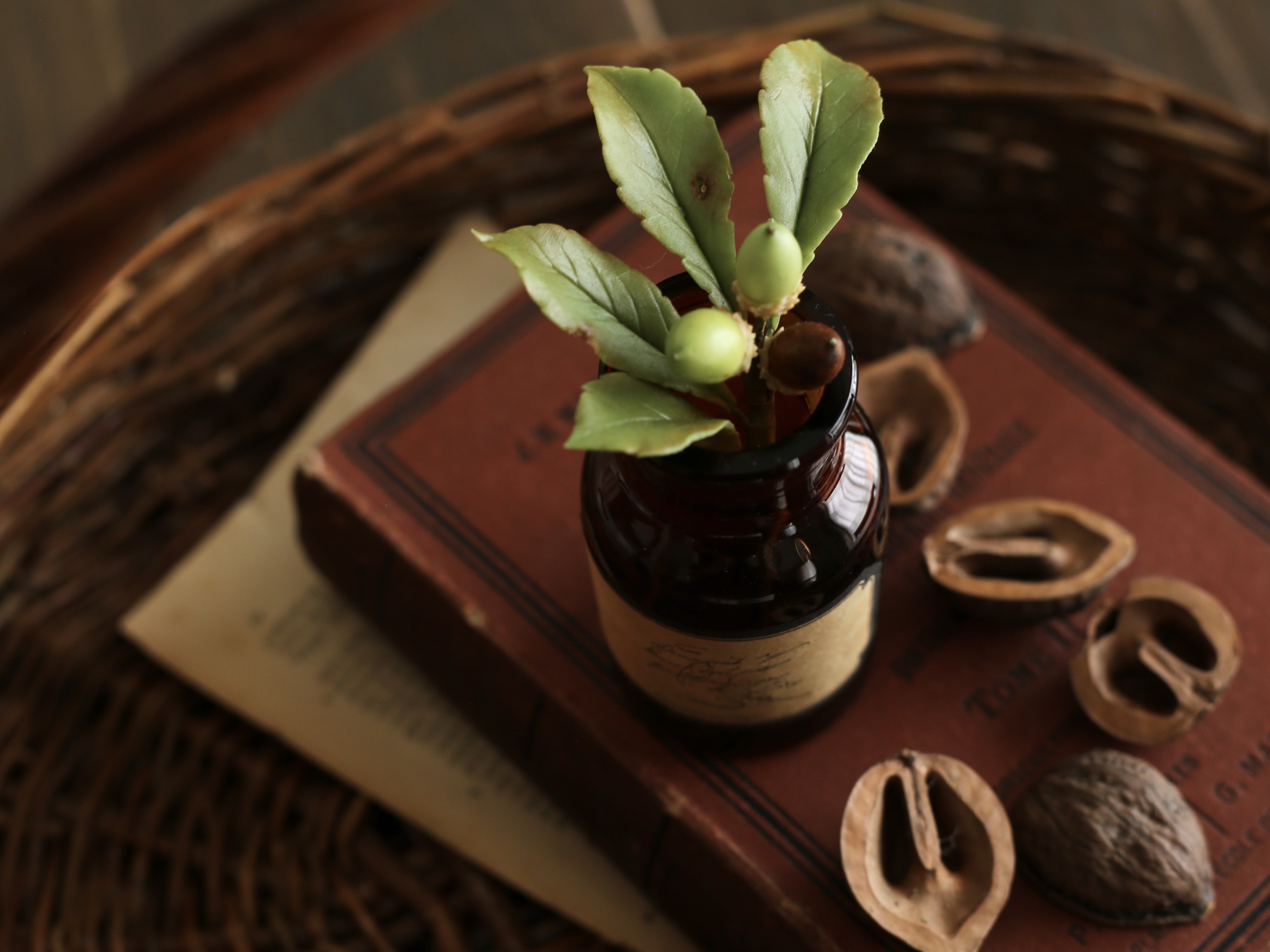 実と葉をそれぞれ組み立て、アンティーク調のブラウンの薬瓶に飾っていただきます。
