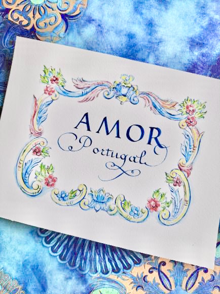 アズレージョをイメージした美しいブルーのデッサンにローマンキャピタル体とフィナンシェール体の美しい文字を組み合わせていきます。