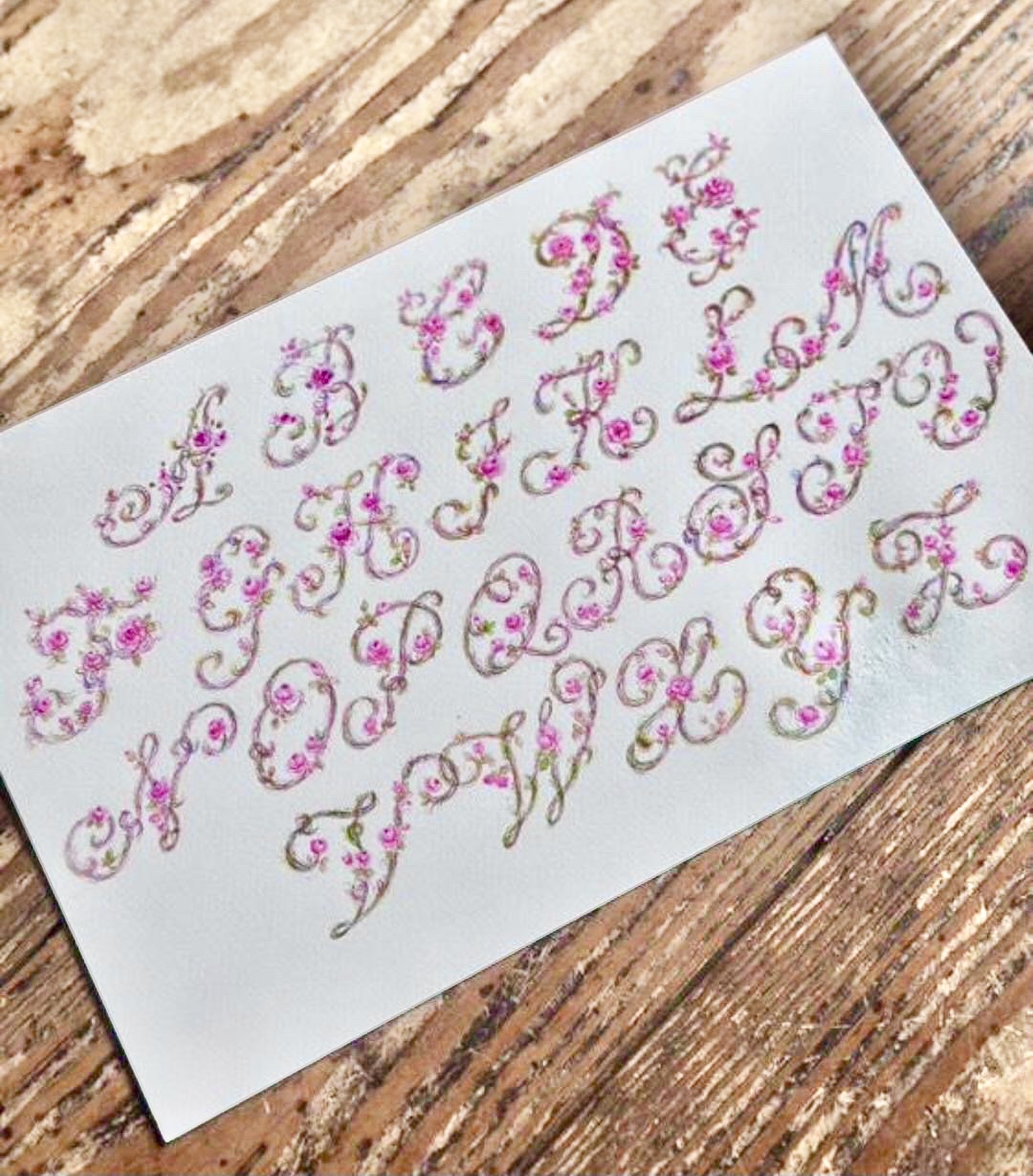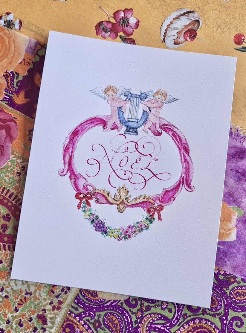 天使の装飾のデッサンに17世紀の地図にも使われているATLASイタリック体でクリスマスのNoëlを書いて仕上げます。