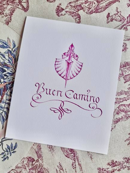 巡礼のシンボル『ホタテと十字架』のデッサンにブリゼ体で「Buen Camino」の文字を組み合わせた美しいカリグラフィー作品に仕上げていきます。