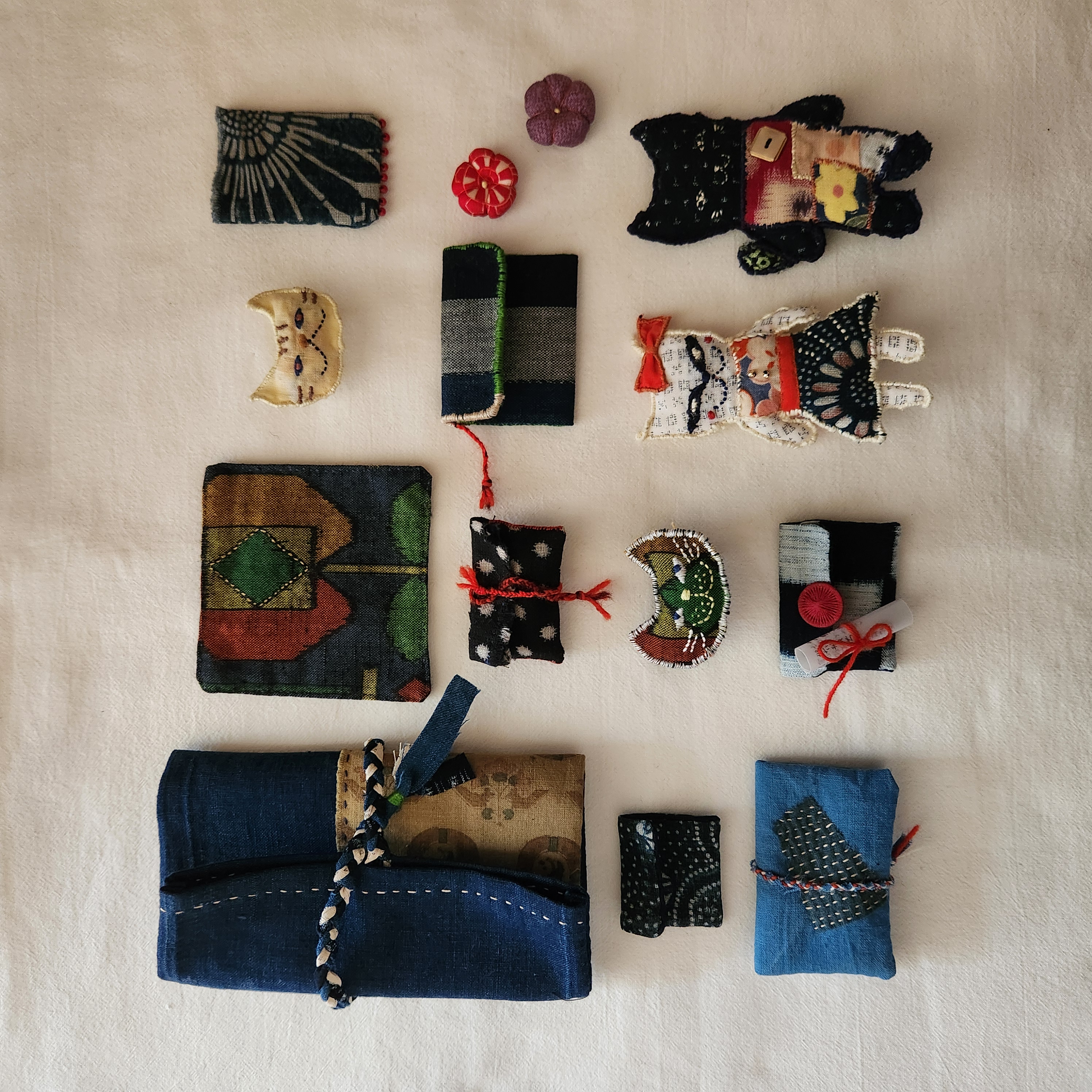 日本の古い布で、小さなものを、ちくちく手縫いでこしらえています。