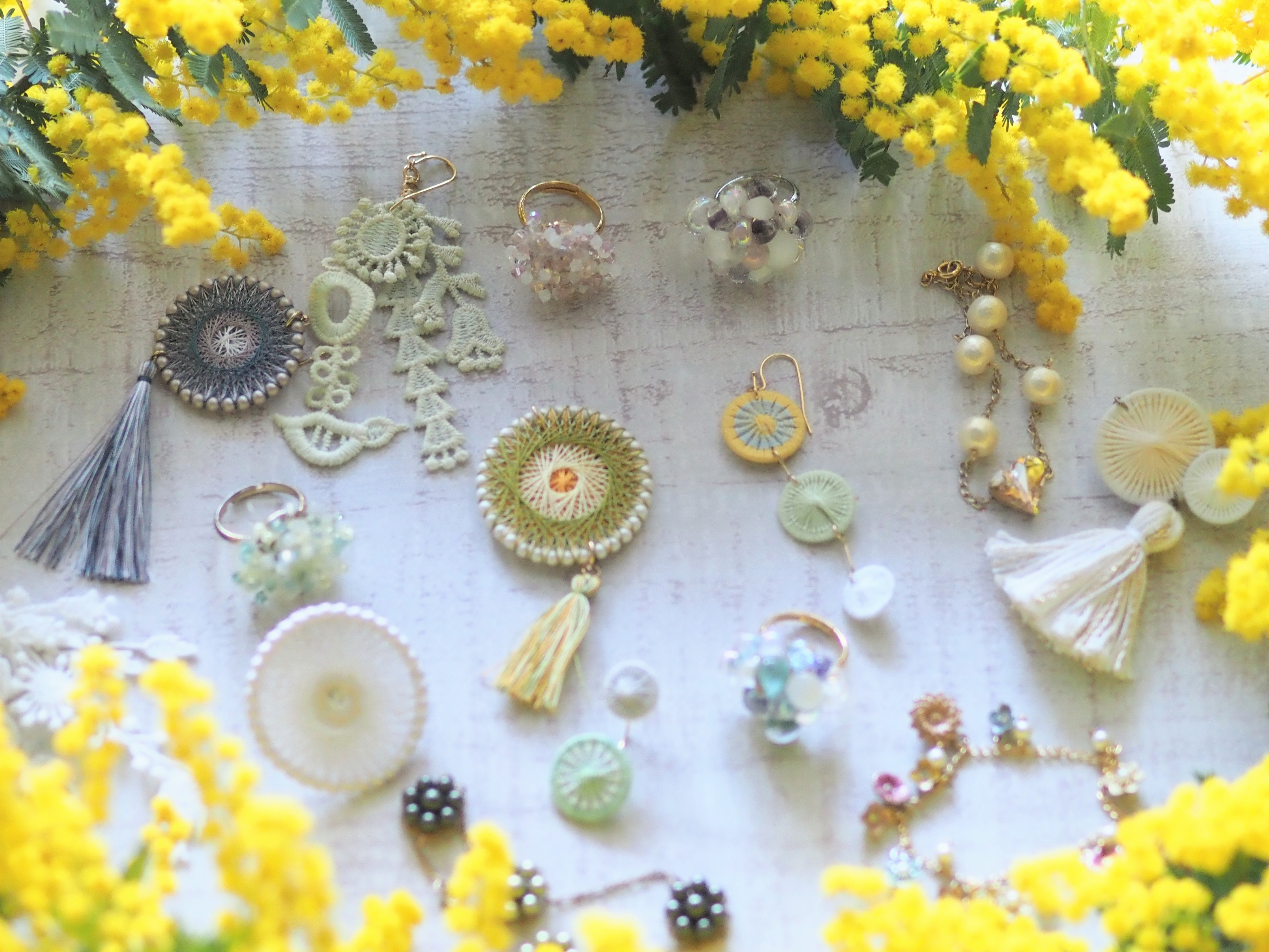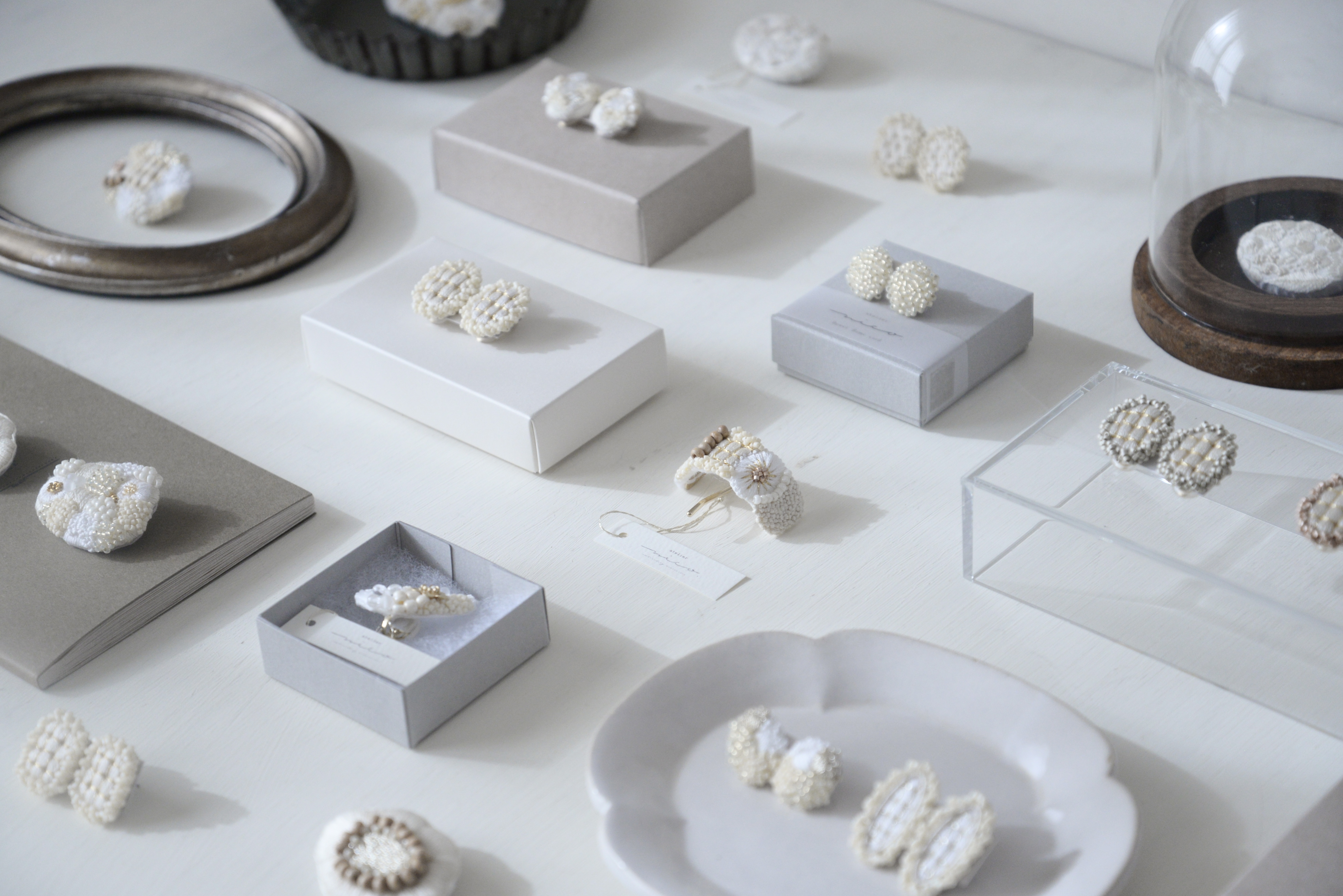 一本の糸からひと針ひと針丁寧に針を進め、繊細で柔らかい雰囲気のアクセサリーをお作りしています。