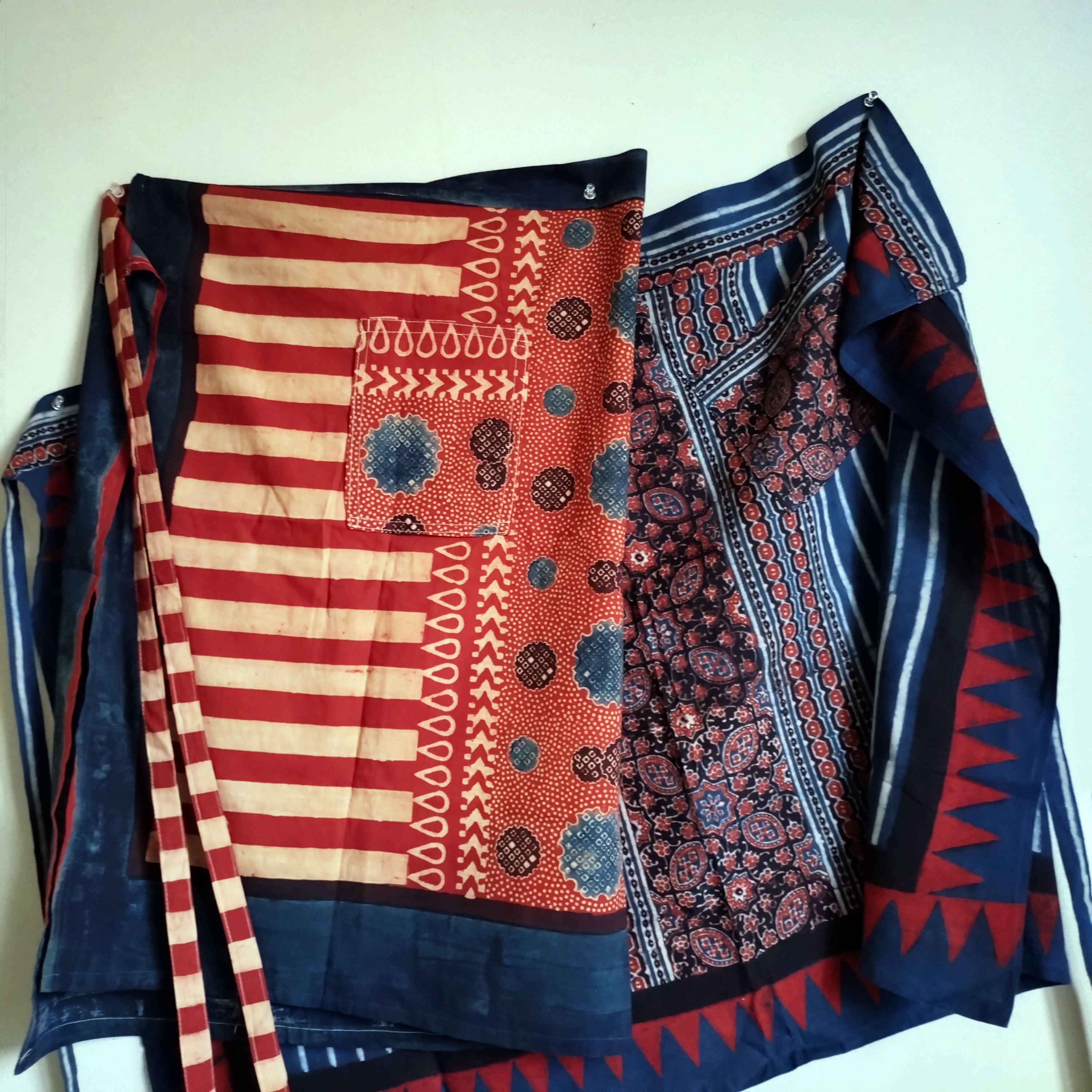 今回はインドのイスラム文化の生地、アジュラックを使ったエプロンも、お持ちします。