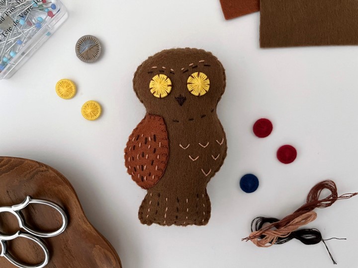 糸ボタンをフクロウの目にしたフェルトマスコットを作りましょう。