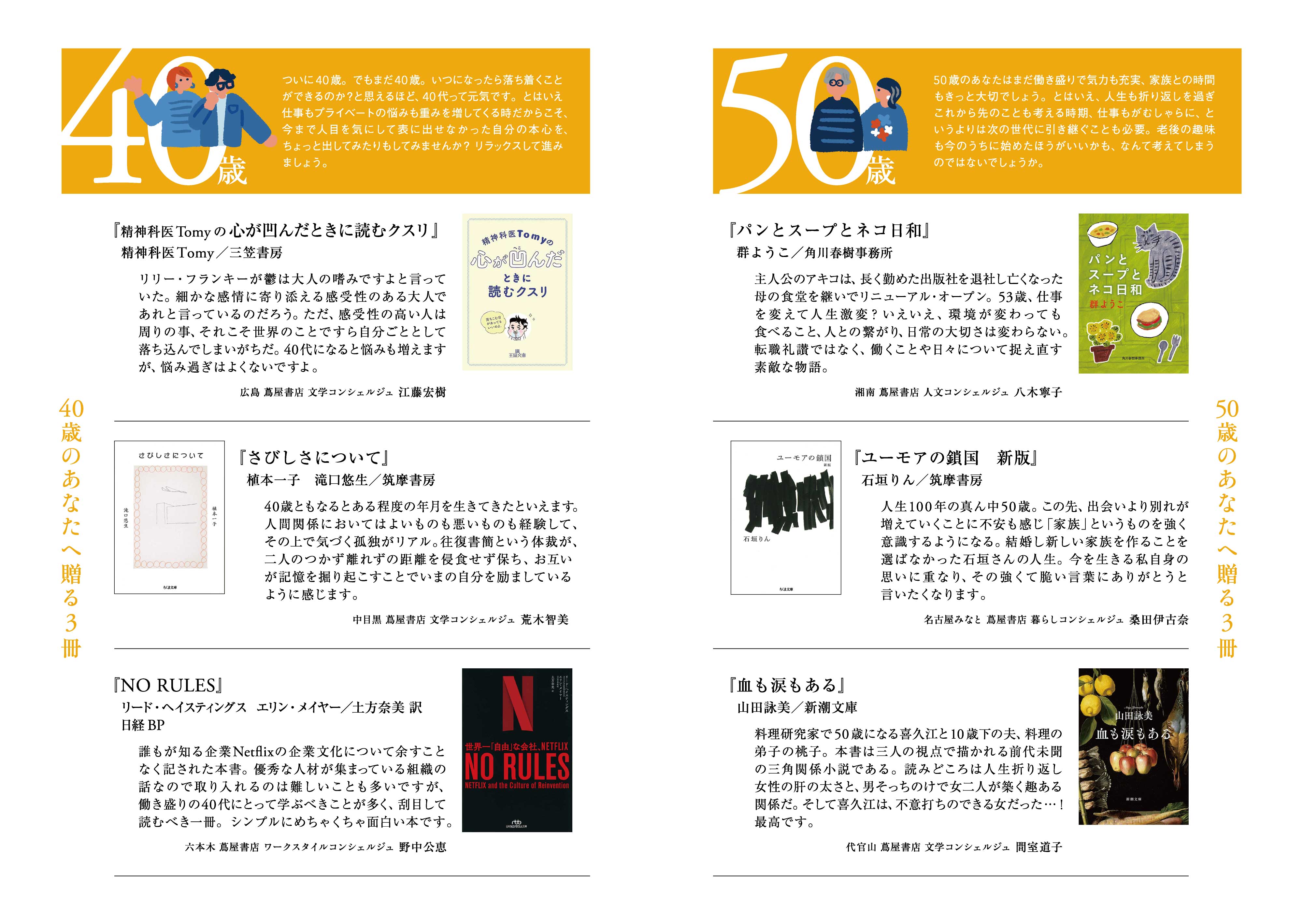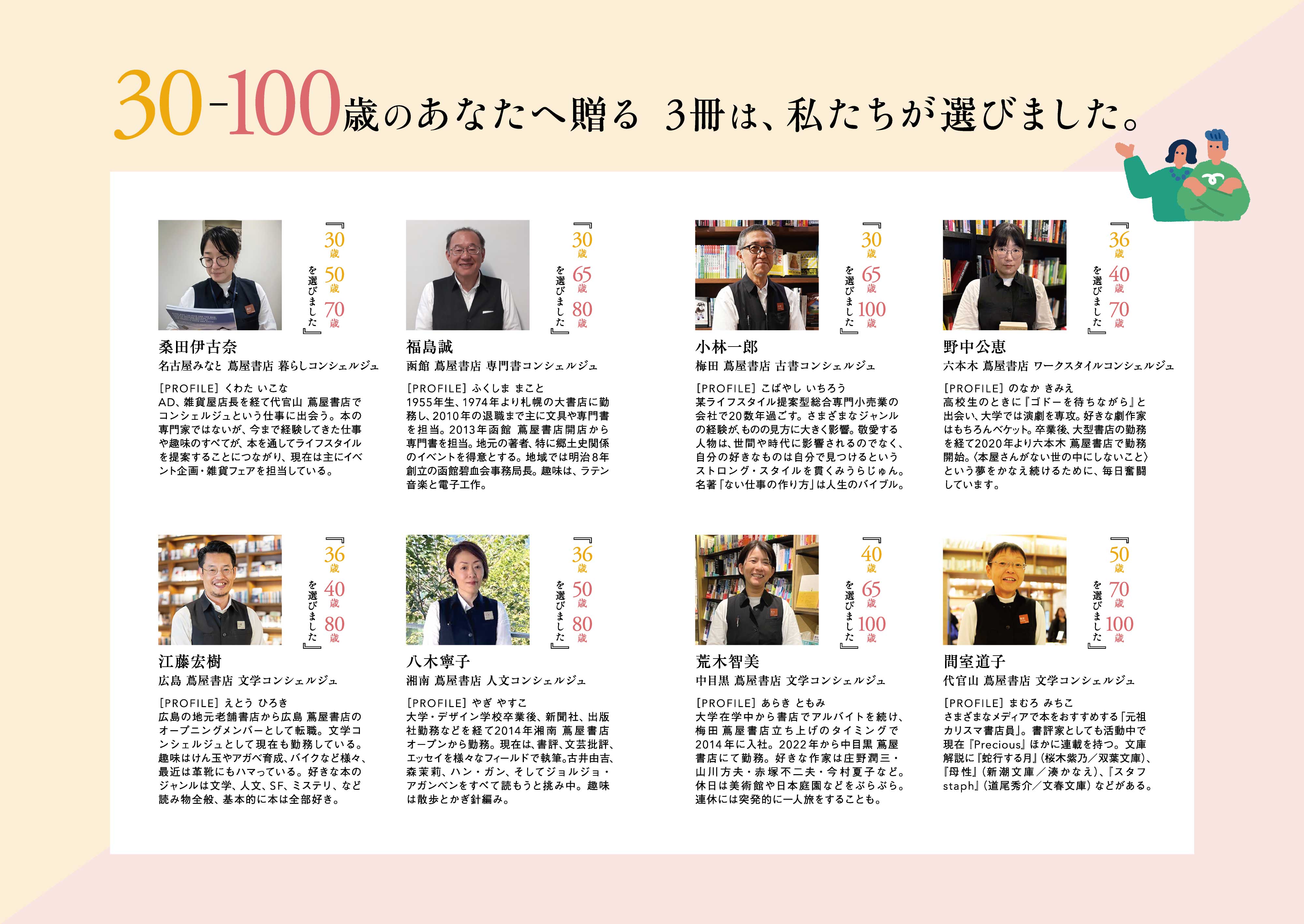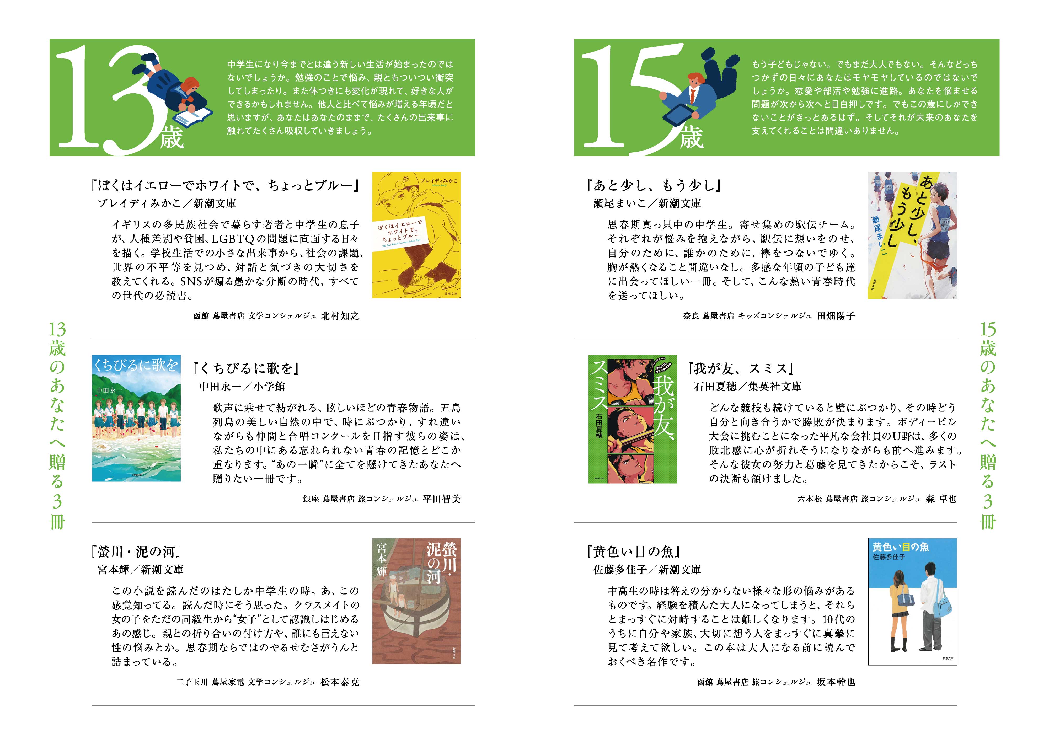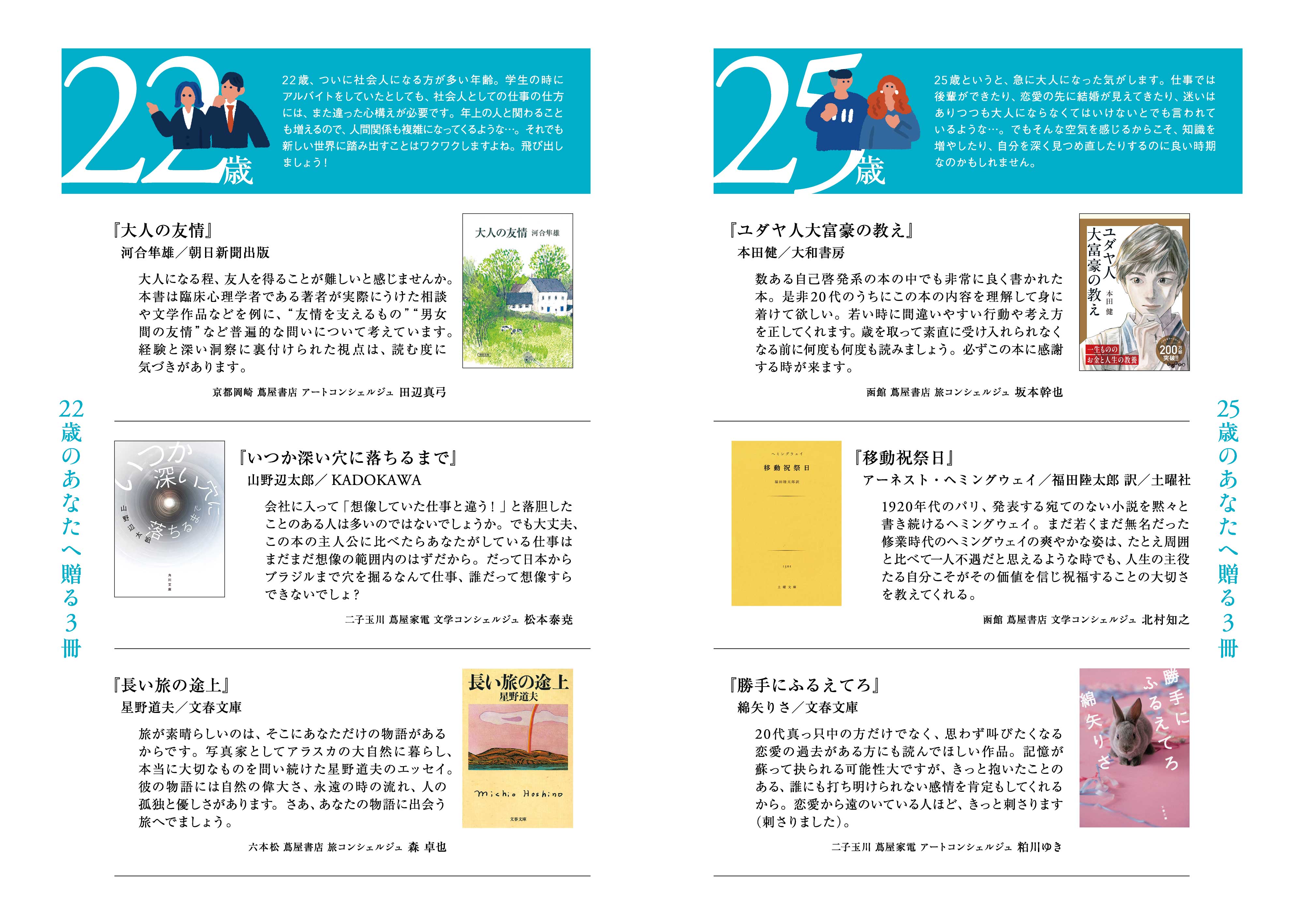 今の自分の年齢に近い本を選んでもいいし、過去や未来の自分を想像して手に取ってみるのも面白いかもしれません。