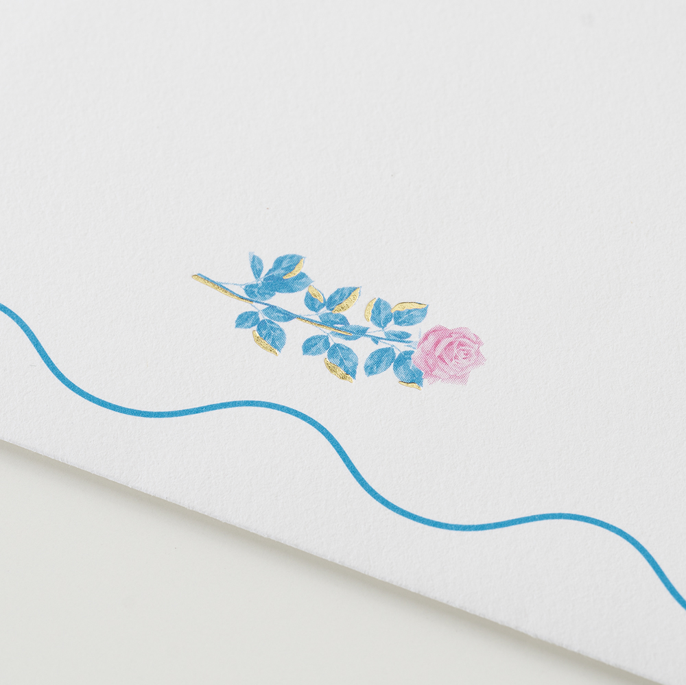 レターセットは、封筒のバラに入っている金の箔押しが高級感があってときめきます。ブルーとピンクの2色がありますが、封筒と便箋を互い違いに使っていただくのもおすすめです。便箋もインクが乗りやすいマットなテクスチャーなので、手紙を書きたくなる紙だと感じました。フレームのようなデザインなので、お部屋に飾るのも素敵だと思います。ギフトに添えるお手紙としても喜ばれそうです。