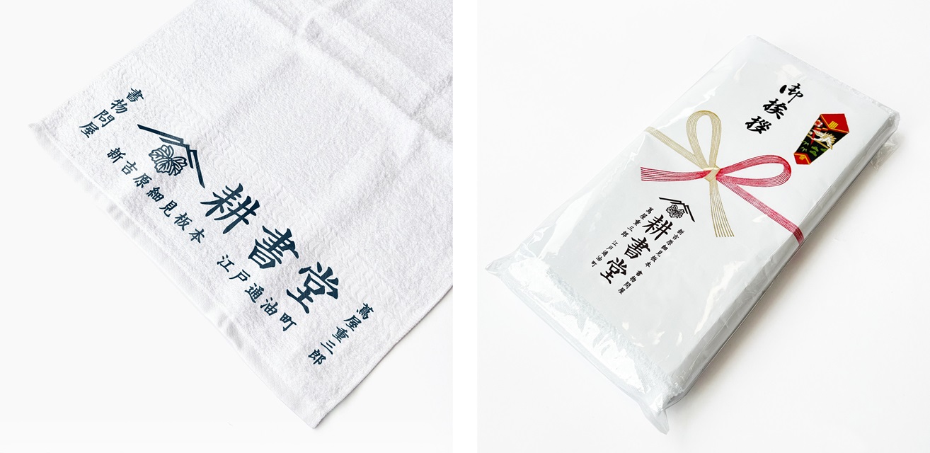 耕書堂が現代に店を構えたら…という発想から生まれた「粗品タオル」。耕書堂の住所の入った熨斗付きです。