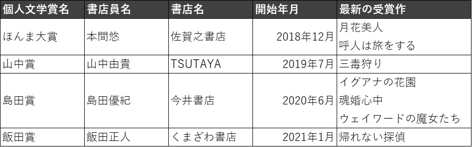 ▼書店員によるおもな個人文学賞(梅田 蔦屋書店調べ)