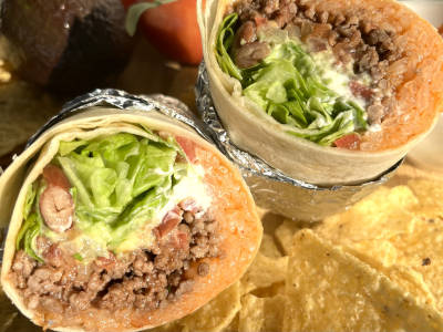 サンフランシスコスタイルのブリトーを販売しています。ライスが入ったボリューム満点のブリトーです!(キッチンカー)