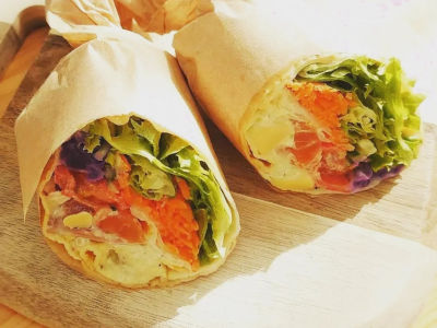 米粉のガレットは、大磯の新鮮な旬の野菜とお肉や自家製スモークサーモンをガレットロールで提供しています。米粉のクレープは、もっちりとした食感の生地に季節のフルーツや北海道産のバター生クリームを使用。(キッチンカー)