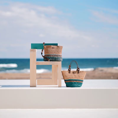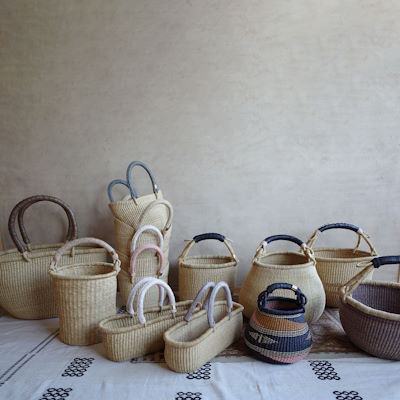 草木染めのハンドルのかごや、三つ編みの持ち手の新作などが並びます。
