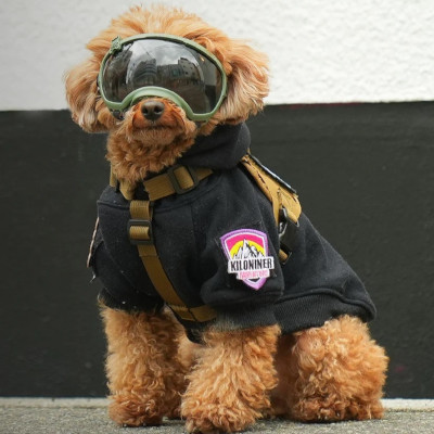 ・本格ミリタリーテイストのドッグギア:キロナイナー製のタフなハーネスやゴーグル