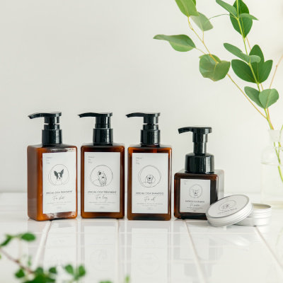 天然由来の植物成分や使用感にこだわり、安心して使える素材だけを求めて商品開発をしています。大切な愛犬に、自然由来のやさしさを。