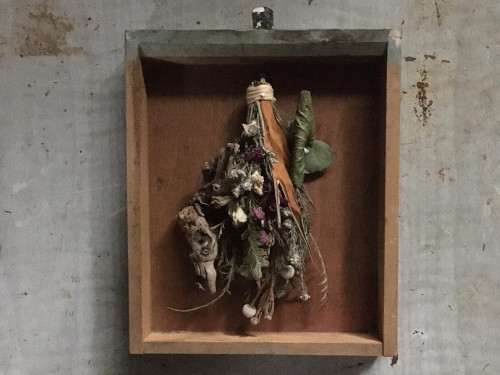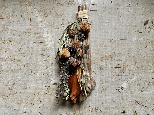 ドライフラワーという枠にとらわれず、実や根や流木を使って植物造形している。植物の面白さを見出し、見るものに新しい感覚をもたらす造形。