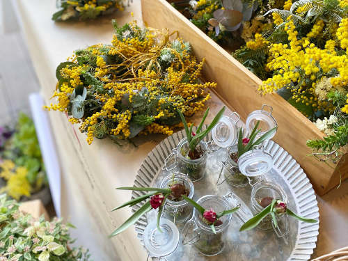 季節の枝葉,生花、花苗、ブーケ、リース、スワッグ、ガラス器、ブリキの器等。花のある暮らしを楽しんでいただける様なアイテムをご用意します。