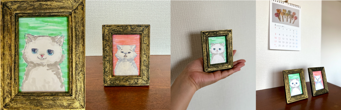 擬ネコ化似顔絵イラストを花房さくらさんが製作した専用フレームに入れてお渡しいたします。